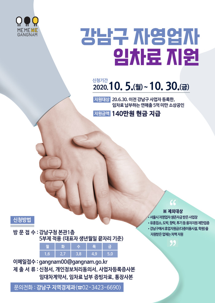 신청은 오는 30일까지 구청 홈페이지에서 신청서, 개인정보처리 동의서 등을 내려 받고, 임대차계약서, 임차료 납부 증빙서류 등을 첨부해 이메일(gangnam00@gangnam.go.kr)로 하거나 생년월일 끝자리 기준 5부제 방식으로 방문 접수하면 된다.
