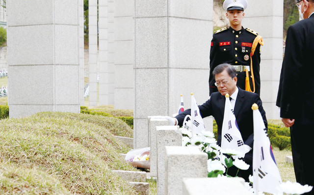 문재인 대통령이 19일 오전 서울 강북구 국립 4.19 민주묘지에서 열린 제60주년 4.19혁명 기념식에 참석한 뒤 故 진영숙 열사 묘비 앞에서 고인을 추모하고 있다.
