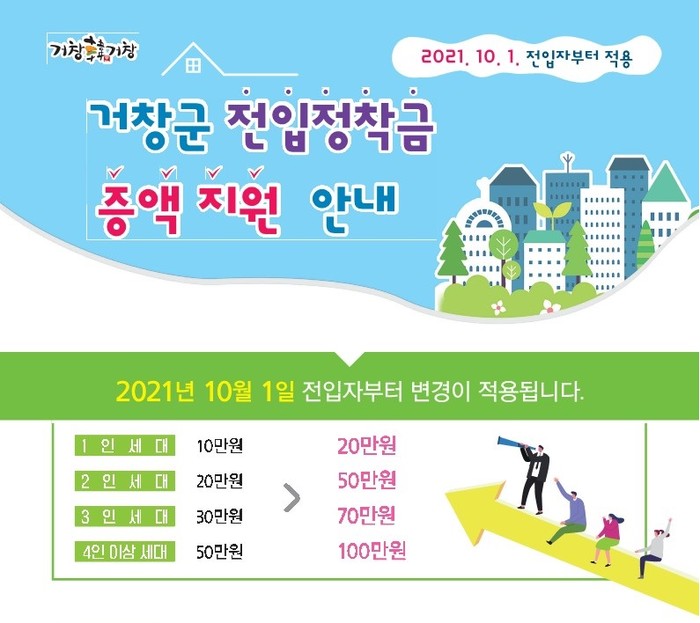 군은 인구감소문제의 선제적 대응을 위해「거창군 인구증가지원조례 시행규칙」을 개정해 10월 1일 전입자부터 전입정착금은 1인 세대 10만 원에서 20만 원, 2인 세대 20만 원에서 50만 원, 3인 세대 30만 원에서 70만 원, 4인 이상 세대 50만 원에서 100만 원 지원 등 체감도 높은 지원정책을 펼치고 있다.