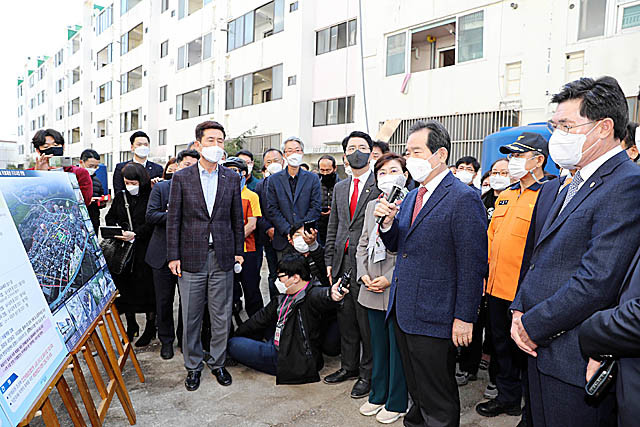 정세균 국무총리가 7일 경북 포항시 지진피해 지역인 대성아파트를 방문, 정부의 지원책을 설명하고 있다.