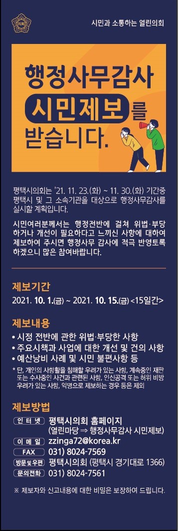 홍선의 의장은 “시민의 소중한 제보와 의견을 바탕으로 올해도 내실 있는 행정사무감사가 이뤄지도록 하겠다”며 “시민 여러분의 많은 관심과 적극적인 참여를 부탁드린다”고 말했다.