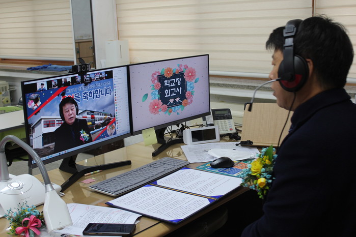 경기 포천시 영중초등학교가 지난 15일 제67회 영중초 '추억해ZOOM 溫(온)라인 졸업식'을 개최했다. 이번 졸업식은 코로나19로 인한 거리두기를 위해 ZOOM 프로그램을 이용해 진행됐다. 사진은 이날 졸업식 행사에서 최용근 교장이 ZOOM 화면을 통해 학교장 회고사를 하고 있는 모습. (사진제공=포천시교육청)