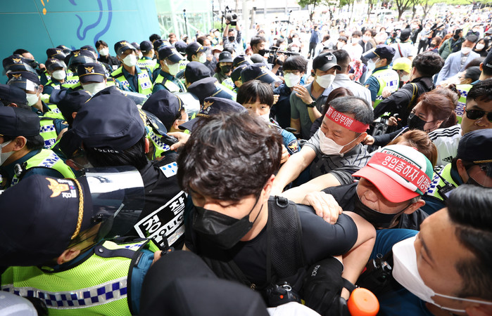 20일 오후 한국유흥음식업중앙회·한국단란주점업중앙회·한국콜라텍협회 관계자 및 업주들이 정부에 집합금지 해제 및 손실보상법 통과를 촉구하며 서울 중구 서울시청 내부로 진입하던 중 경찰과 대치하고 있다.