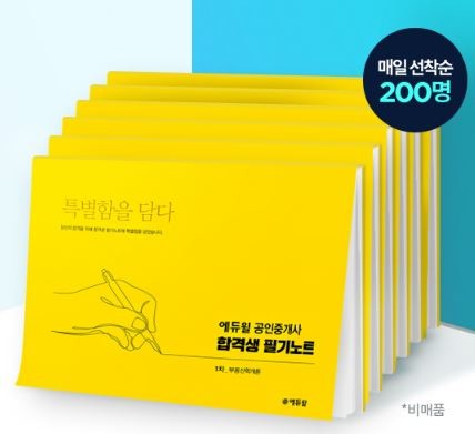 에듀윌 공인중개사 합격생 필기노트는 이달 말일까지 매일 선착순 200명에게 무료로 제공되며, 에듀윌에 2월 1일이후 신규 가입한 회원이라면 누구나 무료로 신청할 수 있다. 세부사항 및 신청은 에듀윌 공식 홈페이지를 통해 확인할 수 있다.