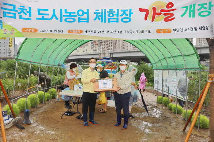 금천구는 최근 안양천 둔치에 있는 금천 도시농업체험장을 개장했다. 구는 이용 주민들에게 텃밭 구획당 배추모종 24본·웃거름 1봉 등을 지급했으며, 도시농업전문가를 초빙해 모종 심는 방법 등을 교육했다. 사진은 개장식에서 유성훈 구청장(왼쪽)이 관악농협으로부터 무·상추 씨앗을 제공받고 기념촬영을 하는 모습. (사진제공=금천구청)