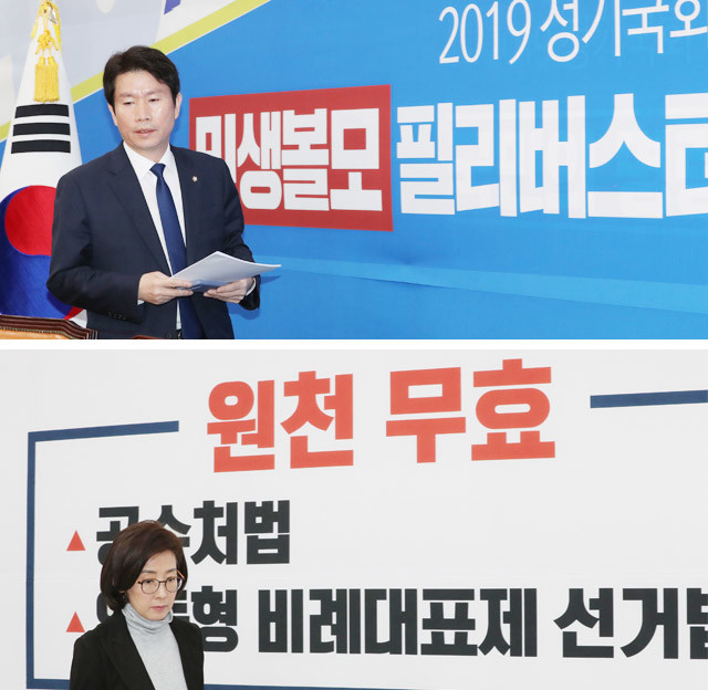 이인영 원내대표가 1 오전 서울 여의도 국회에서 열린 기자간담회에 참석하고 있다(). 자유한국당 나경원 원내대표가 1 오후 서울 여의도 국회 원내대표실에서 열린 기자회견에 참석하고 있다.