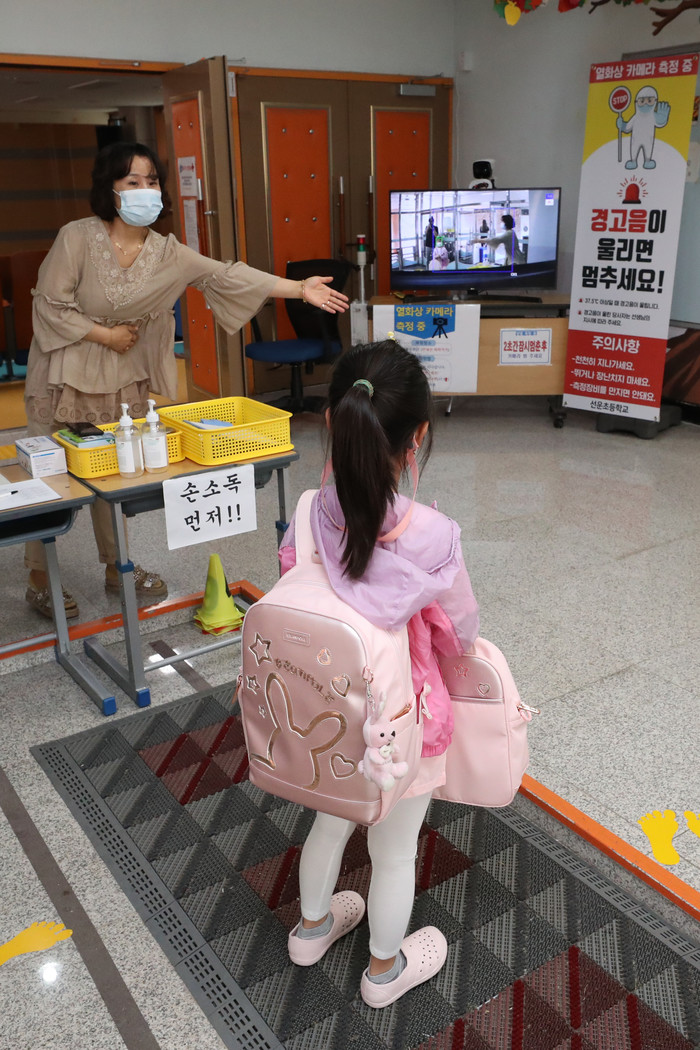 광주지역 각급 학교가 원격수업에서 부분 등교수업으로 전환한 14일 오전 광주 광산구 선암동 한 초등학교의 입구에 학생 등 방문자의 체온 확인을 위한 열화상 카메라가 설치됐다.