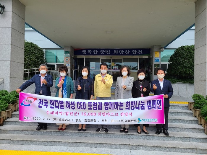 합천군은 서울에서 기업을 경영하는 여성 CEO들로 구성된 한다발 포럼(회장 양우진)이 합천군청을 찾아 마스크 16,000장을 기탁했다고 17일 밝혔다.