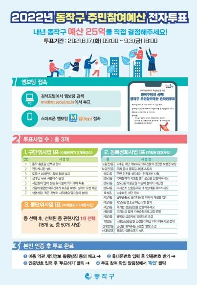 구는 오는 9월3일 오후 6시까지 스마트폰 엠보팅 앱 또는 서울시 엠보팅 홈페이에 접속해, ‘2022년 동작구 주민참여예산 전자투표에 참여해주세요’에서 분야별 하나씩 총3개 사업을 선택하면 된다.