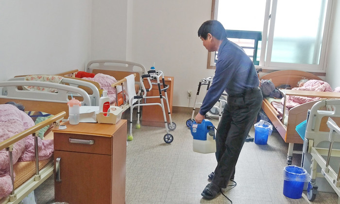 ▲ 친환경 방역소독기를 사용해 노인복지시설을 소독하고 있는 모습. (사진제공=도봉구청) |
