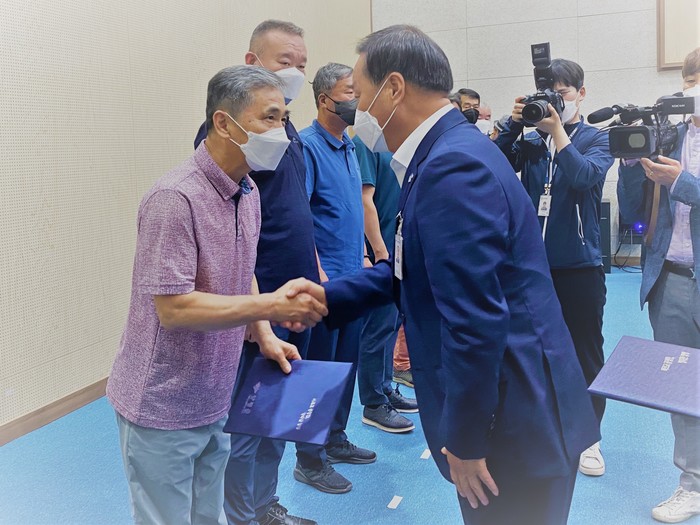 경기 양평군 양평읍은 최근 제2기 양평읍 명예사회복지공무원 위촉식을 개최했다. 명예사회복지공무원은 무보수 명예직으로 복지 위기가구를 적극 발굴·제보하는 등의 인적안전망 역할을 수행할 예정이다. 사진은 이날 정동균 군수(오른쪽)가 위촉장을 수여하고 있는 모습. (사진제공=양평군청)