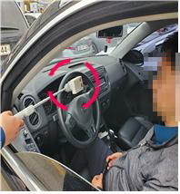 비접촉식 감지기는 지지대에 부착된상태에서 운전석 창문 너머에 있는 운전자의 음주 여부를 감지할 수 있다.