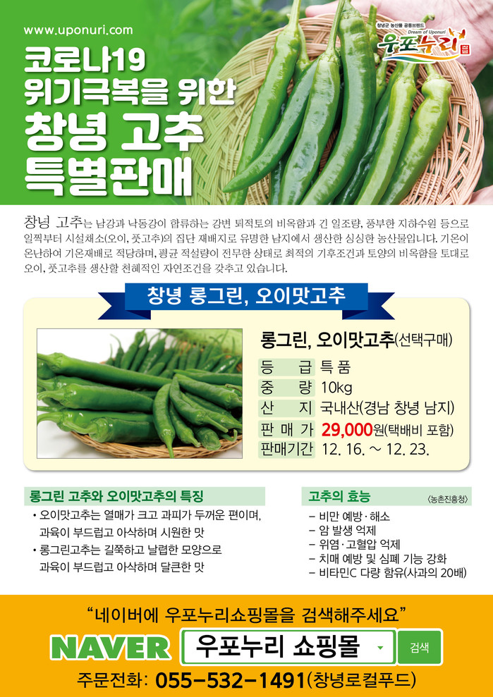 창녕군 농특산물 온라인 직매장 ‘우포누리 쇼핑몰’을 통해 창녕군 풋고추 소비촉진행사에 참여할 수 있다.