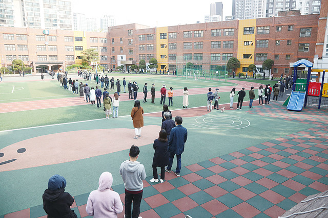 제21대 총선 투표일인 15일 오전 서울 서초구 원명초등학교 투표소에서 시민들이 투표 순서를 기다리고 있다.