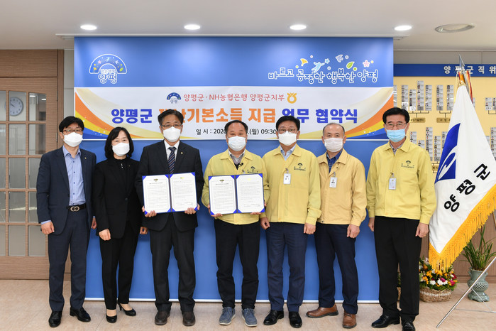 경기 양평군이 6일 NH농협은행 양평군지부와 재난기본소득 지급을 위한 업무 협약을 체결하고 본격적인 '양평군 재난기본소득' 지급을 위한 첫 발걸음 내디뎠다. 사진은 협약 체결 후 기념촬영하는 정동균 군수(가운데)와 오정수 지부장 등 관계자들의 모습. (사진제공=양평군청)