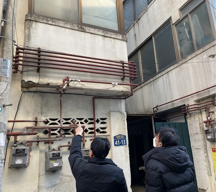 | ▲ 구청 관계자가 건축물 안전점검을 진행하고 있다. (사진제공=종로구청) |
