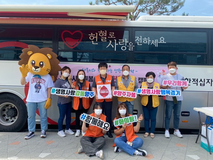 경기 양주시자원봉사센터가 지난 14일 '세계 헌혈자의 날'을 맞아 자봉이와 함께하는 선한캠페인 ‘헌혈의 날’을 운영했다. 코로나19 장기화로 인한 혈액수급 문제를 해결하기 위한 이번 행사는 대한적십자사 양주지구협의회·대한적십자사 서울동부혈액원과 연계해 이뤄졌다. 사진은 이날 참여한 봉사자들과 자봉이가 기념촬영을 하는 모습. (사진제공=양주시청)