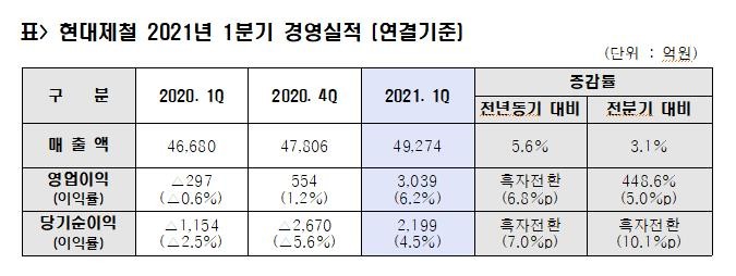 이날 현대제철의 발표에 따르면 연결기준 매출액은 전년 동기 대비 5.6% 증가한 4조9274억원, 영업이익은 흑자전환하며 3039억원을 기록했다.