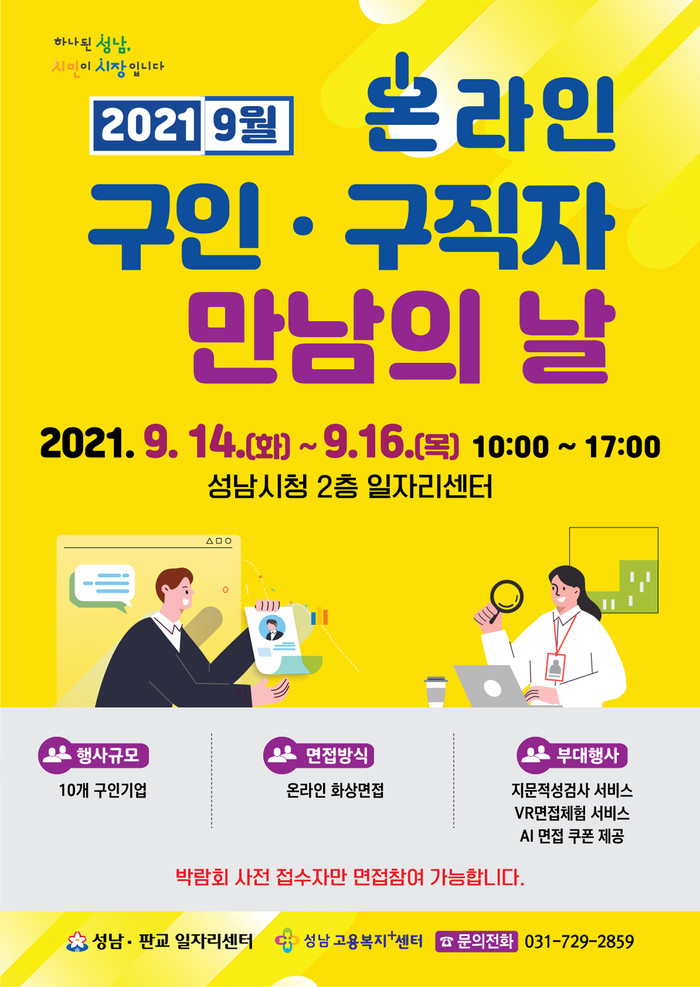 [성남=오왕석 기자] 성남시(시장 은수미)는 오는 9월 14일부터 16일까지 ‘온라인 구인·구직자 만남의 날’ 행사를 연다.