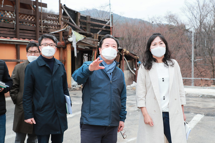 조광한 경기 남양주시장이 주말인 지난 27일 청학천 2단계 공원화사업 추진 중인 청학밸리리조트와 청학아트라이브러리 조성 부지 현장점검을 했다. 사진은 조 시장(가운데)이 청학밸리리조트 조성안에 대해 작가들에게 설명하고 있는 모습. (사진제공=남양주시청)