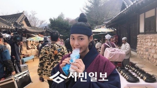 공개된 사진 속 설현은 드라마 속 의상을 입고 상투를 튼 모습이 담겨있다.