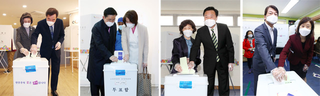 제21대 국회의원 선거일인 15일 여야 정당의 지도부와 후보들이 일찌감치 각 지역에서 투표를 마쳤다. 왼쪽부터 서울 종로 지역에 출마한 더불어민주당 이낙연 후보와 미래통합당 황교안 후보, 민생당 손학규 상임선대위원장 내외, 국민의당 안철수 대표 내외.