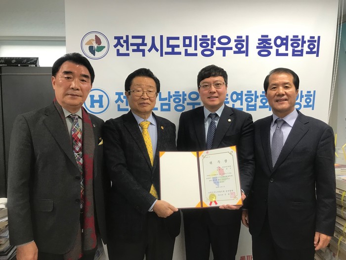 | ▲ 이관수 의장(왼쪽2번째)이 전국시도민향우회와 전국호남향우회 자문위원으로 위촉장을 받은 뒤 관계자들과 기념사진을 찍고 있다. (사진제공=강남구의회) |