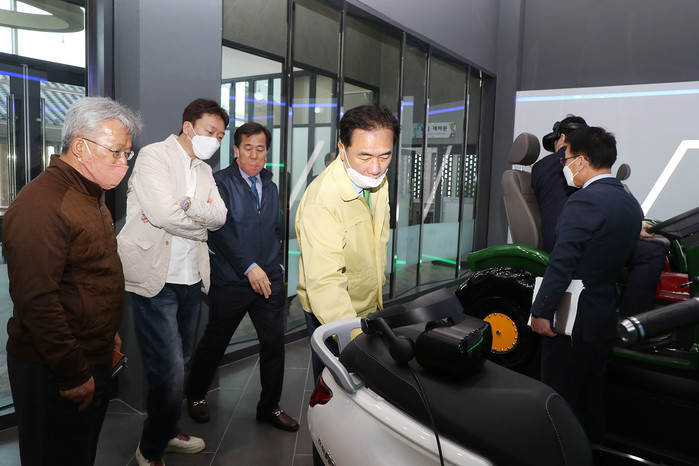 최근 정장선 경기 평택시장이 개관을 앞둔 평택생명농업센터와 로컬푸드 종합센터를 방문해 시설물을 사전 점검했다. 이날 정 시장은 시설물 전층을 살펴보며 안전상태를 확인했다. 사진은 농업센터 시설물을 살펴보는 정 시장(가운데)의 모습. (사진제공=평택시청)