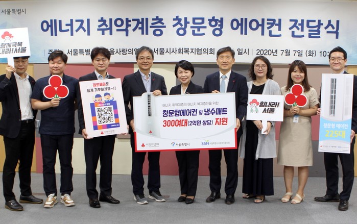 서울 사랑의열매가 7일 서울시·서울사회복지협의회와 함께 서울시 에너지취약계층(고독사 위험가구 및 복지사각지대 가구)에 냉방용품(2억원 상당)을 지원하는 창문형에어컨 등 냉방용품 전달식을 개최했다. 사진은 전달식에서 관계자들이 기념촬영을 하는 모습. (사진제공=서울 사랑의열매)