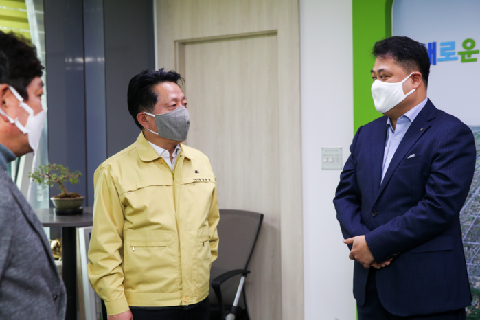 경기 부천시가 최근 NH농협 부천시지부로부터 코로나19 예방 물품 구입 지원을 위한 기부금 2000만원을 전달받았다. 기부금은 지역화폐 '부천페이'로 지역내 저소득층에 전달될 예정이다. 사진은 장덕천 시장(가운데)이 관계자에게 감사의 인사를 전하는 모습. (사진제공=부천시청)