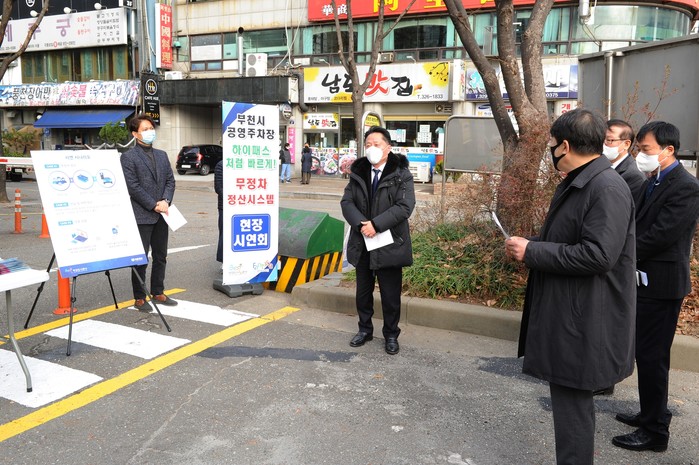 경기 부천시가 27일 ‘무정차 정산 서비스’ 시연회를 열고, 시청 등 10곳을 대상으로 시범 운영을 시작했다. ‘무정차 정산 서비스’는 주차장을 이용하는 고객들이 출구에서 요금을 지불할 때, 고속도로의 하이패스와 같이 멈추지 않고 출차할 수 있는 기능이다. 사진은 현장 시연회에서 장덕천 시장(가운데)이 인사말을 하고 있는 모습. (사진제공=부천시청)