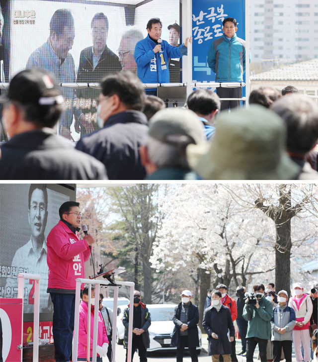 제21대 국회의원선거에서 서울 종로구에 출마한 더불어민주당 이낙연 후보가 5일 오후 종로구 무악동의 한 아파트 단지 앞에서 유세 차량에 올라 발언하고 있다(위). 미래통합당 서울 종로 황교안 후보도 이날 서울 종로구 평창동에서 열린 유세에서 유세차량에 올라 연설하고 있다.