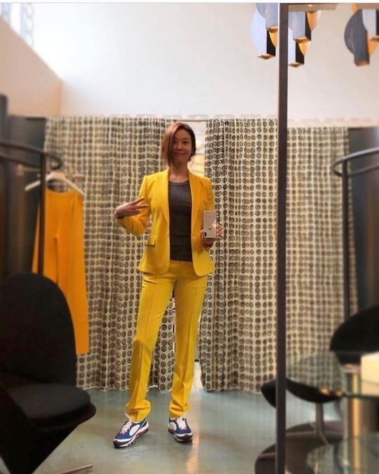 사진 속에는 노란색 슈트를 입은 옥주현의 모습이 담겼다. 옥주현은 브이포즈를 취한 채 미소짓고 있다. 옥주현의 군살 하나 없이 늘씬한 몸매가 시선을 사로잡는다.