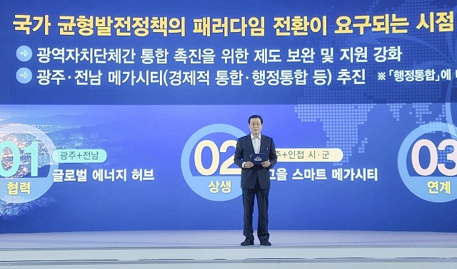 이 시장은 ‘광주·전남 초광역 협력 추진사례’ 발표를 통해 “광역자치단체 간 협력사업도 진일보한 것이지만, 그보다 더 중요한 것은 역사적 정체성이 같고 보완관계가 깊은 자치단체 간 통합이 촉진될 수 있도록 정부가 제도를 보완하고 지원을 강화해야 한다”고 강조했다.