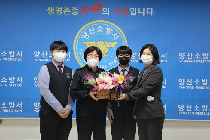 양산소방서(서장 박정미)는 지난 2일 범어중학교 DIY 범어봉사단 학생들로부터 직접 만든 꽃바구니와 감사 인사를 받았다고 3일 밝혔다.