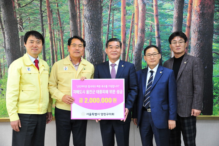 서울 양천구의회가 최근 발생한 제18호 태풍 미탁으로 큰 피해를 입은 울진군을 방문해 위문성금 200만원을 전달했다. 사진은 성금 전달 후 기념촬영을 하고 있는 (왼쪽부터)장시원 을진군의장, 전찬걸 울진군수, 신상균 양천구의장, 오진환 양천구의회 부의장, 박종호 양천구의원의 모습.(사진제공=양천구의회)