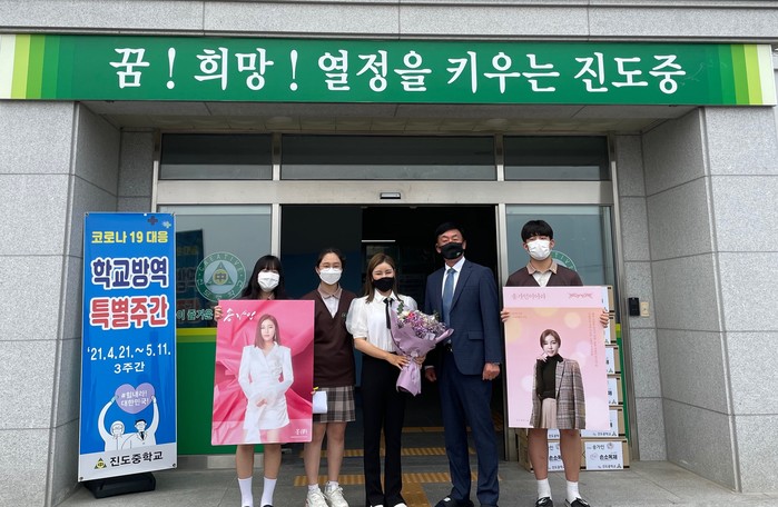 이날 진도중·지산중학교 등을 방문한 송가인씨는 2집 앨범과 자서전, 손 소독제 등 약 1000여만원 상당의 물품을 후배들에게 전달하고 꿈을 향한 대화의 시간도 보냈다.