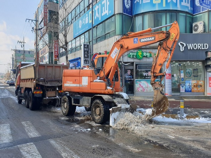특히 대설특보 이후 9일부터(2일간) 영광읍 시가지 주요 간선도로 8개노선 10km 구간에 백호 15대, 덤프 19대, 공무원 등 인력 60명을 동원하여 영하의 날씨에도 불구하고 주말을 반납한 채 도로 갓길 잔설작업을 실시하였다.