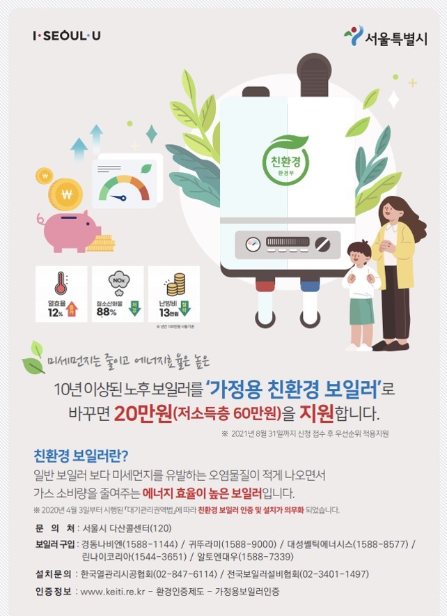 신청 기간은 이달 14일부터 오는 8월31일까지로, 지원 희망자는 보일러 교체 관련 서류를 첨부해 구청 맑은환경과로 방문 및 우편, 이메일로 신청서를 제출하면 된다.