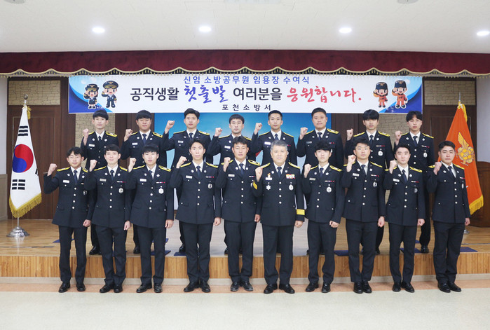 경기 포천소방서가 9일 오전 본서 3층 대회의실에서 신임 소방공무원 17명에 대한 임용 신고식을 실시했다. 사진은 한경복 소장(앞줄 오른쪽 다섯 번째)와 신임 소방공무원이 포즈를 취하며 기념촬영을 하고 있는 모습. (사진제공=포천소방서)