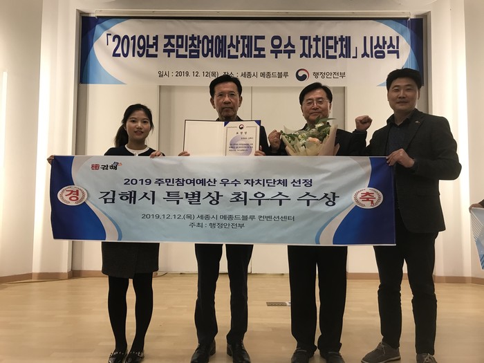 김해시는 행정안전부 2019년도 주민참여예산제 우수기관 평가에서 특별상 분야 최우수를 수상하며 전국 우수기관으로 선정됐다고 밝혔다.