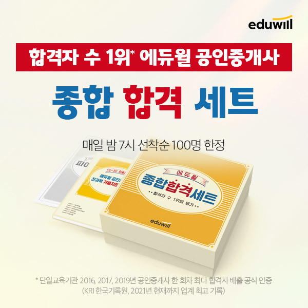 [시민일보 = 여영준 기자] 에듀윌 공인중개사는 매일 오후 7시 선착순 100명의 회원에게 공인중개사 한정판 합격 자료를 제공하는 ‘종합 합격 세트’ 이벤트를 진행한다고 6일 밝혔다.