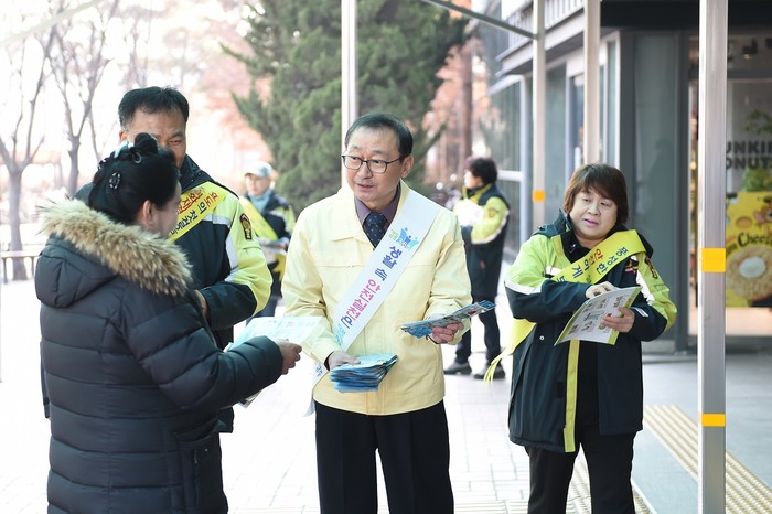 경기 양주시가 '제286차 안전점검의 날'을 맞아 최근 덕정역 일대에서 안전사고 예방 캠페인을 펼쳤다. 이날 캠페인은 조학수 부시장과 유관기관 관계자 등 50여명이 참석한 가운데 진행됐다. 사진은 조 부시장(가운데)이 시민들에게 홍보물을 나눠주는 모습. (사진제공=양주시청)
