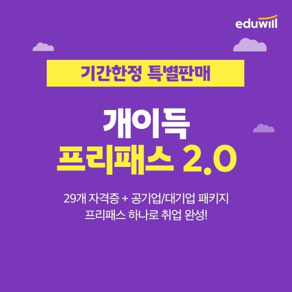 [시민일보 = 여영준 기자] 종합교육기업 에듀윌(대표 박명규) ERP정보관리사는 29개 자격증 및 공기업, 대기업 8개 패키지 전 강좌를 모두 수강할 수 있는 ‘개이득 프리패스 2.0’ 상품을 오는 31일까지 기간 한정으로 특별 판매한다고 3일 밝혔다.