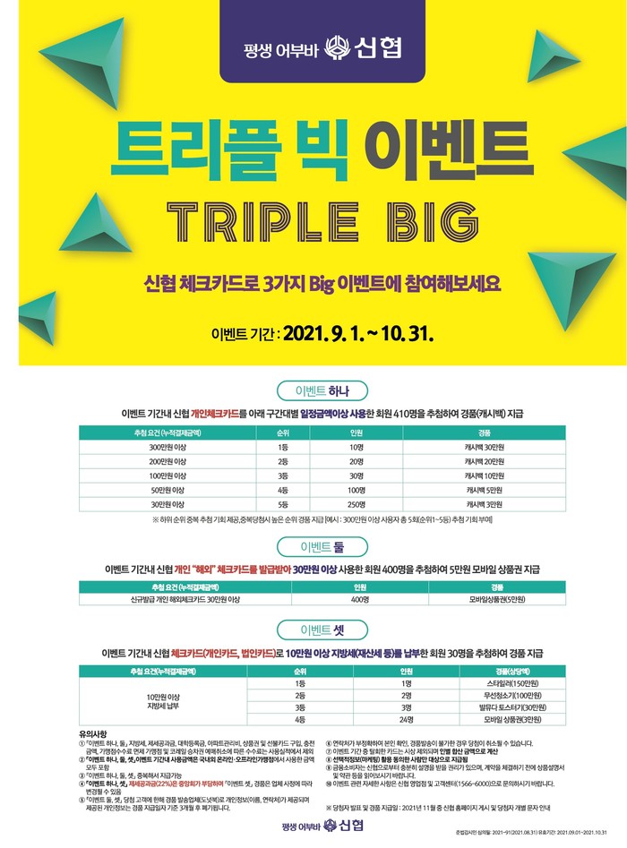 [시민일보 = 여영준 기자] 신협중앙회(이하 신협)가 이달 1일부터 10월 31일까지 신협 체크카드 ‘트리플 빅(Triple Big)’이벤트를 실시한다.