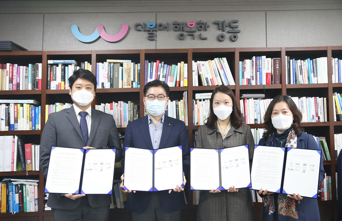 서울 강동구는 지난 28일 오랄-비·테라사이클·쿨시티강동네트워크와 함께 폐칫솔을 모아 줄넘기·플라스틱 화분 등 새로운 제품으로 탄생시키는 친환경 프로젝트 ‘블루우체통 캠페인’ 업무협약을 맺었다. 사진은 업무협약식에서 이정훈 구청장(왼쪽에서 두 번째)이 관계자들과 기념촬영을 하고 있는 모습. (사진제공=강동구청)