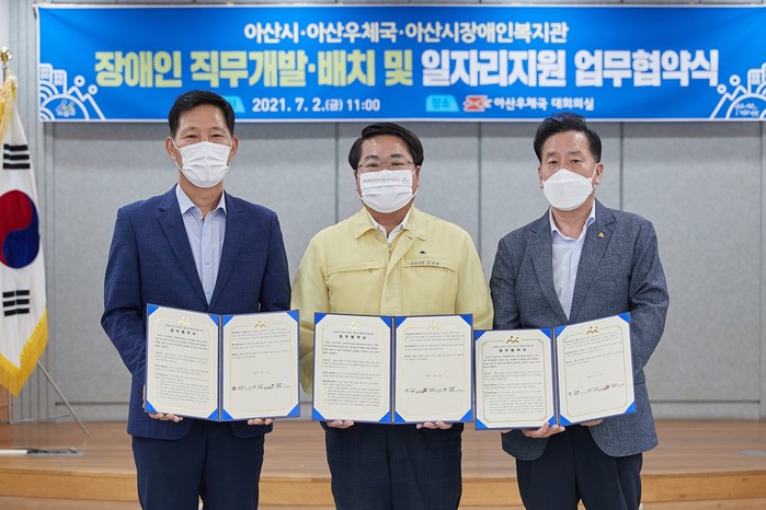 [아산=박명수 기자] 충남 아산시가 2일 아산우체국, 아산시장애인복지관과 장애인의 일자리 직무개발·배치 및 사회참여 확대를 위한 업무협약을 체결했다.