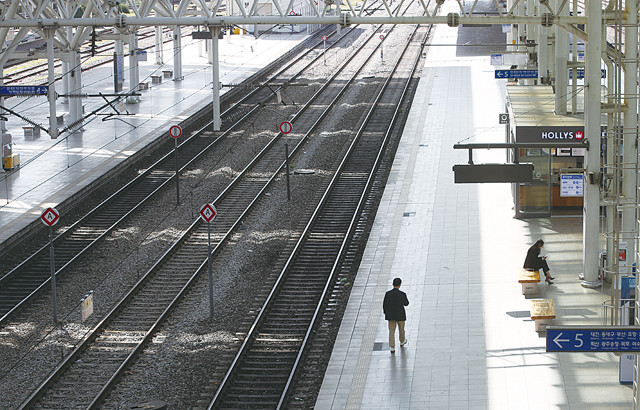 철도노동조합 한시 파업 사흘째인 13 오전 서울역 플랫폼에서 시민이 걷고 있다. 노조는 총인건비 정상화, 노동시간 단축과 철도안전을 위해 2020 1 1일부터 시행하기로 4 2교대 근무 형태 도입을 위한 안전인력 충원, 생명안전업무 정규직화와 자회사 처우개선 노·사·전문가협의체 합의 이행을 요구하고 있다.