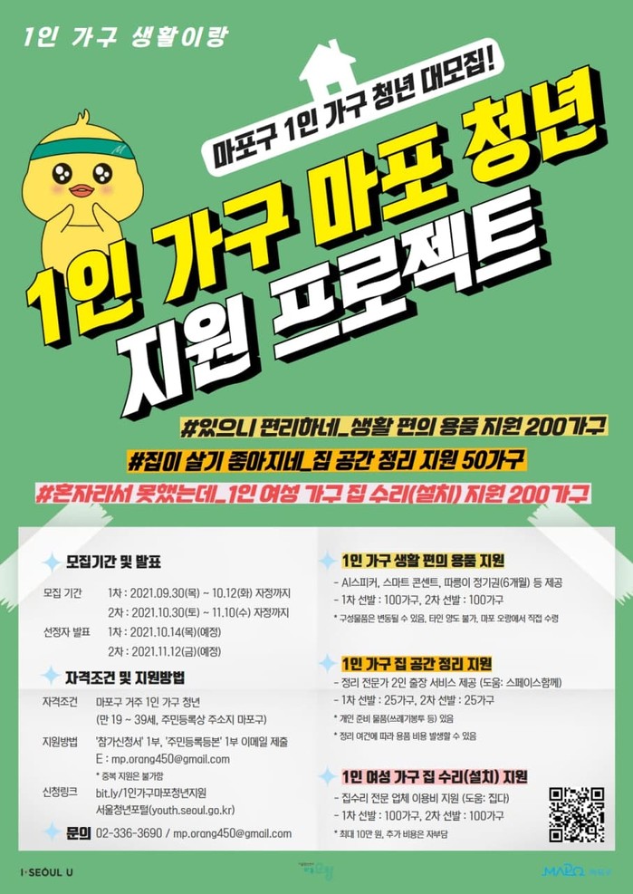 이번 프로젝트는 구에서 위탁·운영하고 있는 서울청년센터 마포오랑를 통해 진행하며, ▲1인가구 생활편의 물품지원 ▲1인가구 집 공간 정리지원 ▲1인 여성가구 집수리 지원 총 세 가지 사업을 진행한다.