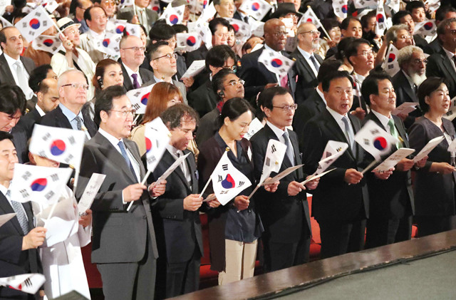 국무총리와 여야 4 대표 등이 3 오전 서울 세종문화회관 대극장에서 ‘모두가 함께, 세상을 이롭게’란 주제로 열린 4351주년 개천절 경축식에서 개천절 노래를 제창하고 있다.